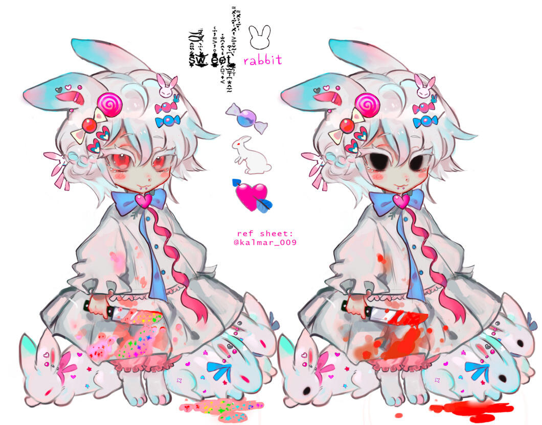 Bored to tears by his royal suitors, Prince Ferris sought a love that was true. Thus, he engaged with many a lover. Yet due to the reclusive Prince's instability and mental ailments, his romantic relationships always ended in ruin.One day, Ferris heard that rabbits symbolize fertility and rebirth of the self. Upon this discovery, he consumed the beating heart of a white rabbit, perhaps in an attempt to become one with its purity. In turn, he partially fused with it and gained rabbit-like abilities.However, even after this transformation, Ferris only continued to fall short in love. In fact, his neuroticism was elevated upon the consumption.Though he bedecks himself in pastels and frills to fill the void in his heart, Ferris still longs for an honest love. He continues to try, because despite everything, he will never give up on love. Even if he has to carve his next lover's heart out of their chest and consume it.